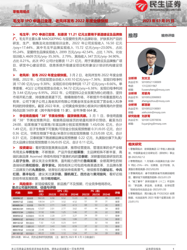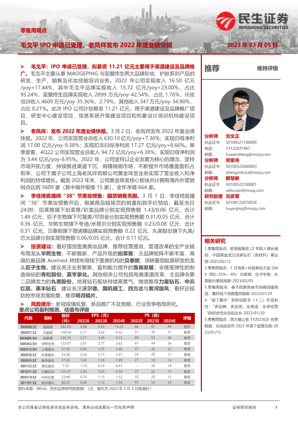 【民生证券】【20230305】零售周观点:毛戈平IPO申请已受理,老凤祥发布2022年度业绩快报-19页