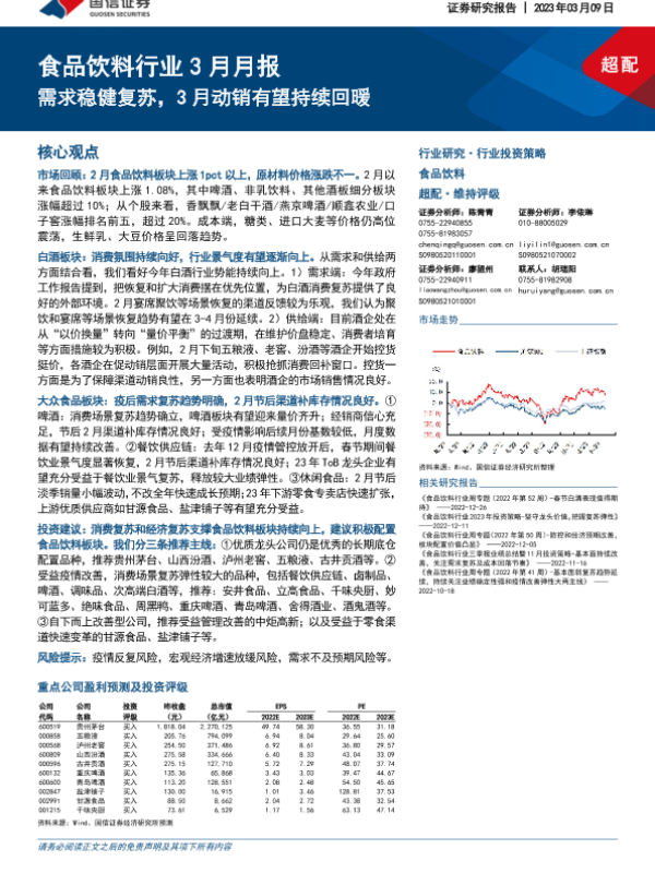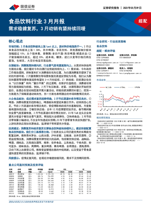 【国信证券】【20230309】食品饮料行业3月月报:需求稳健复苏,3月动销有望持续回暖-18页
