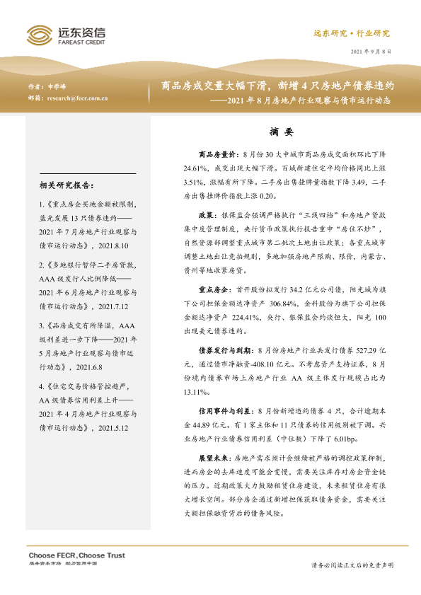 【远东资信】【20210908】商品房成交量大幅下滑,新增 4 只房地产债券违约——2021年8月房地产行业观察与债市运行动态-19页