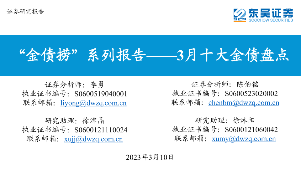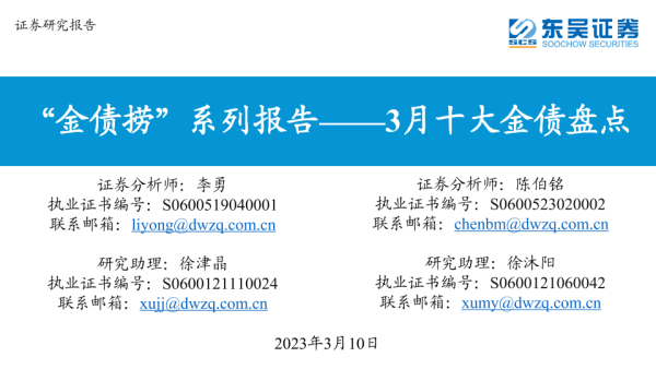 【东吴证券】【20230310】“金债捞”系列报告:3月十大金债盘点-44页