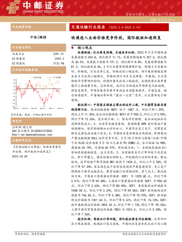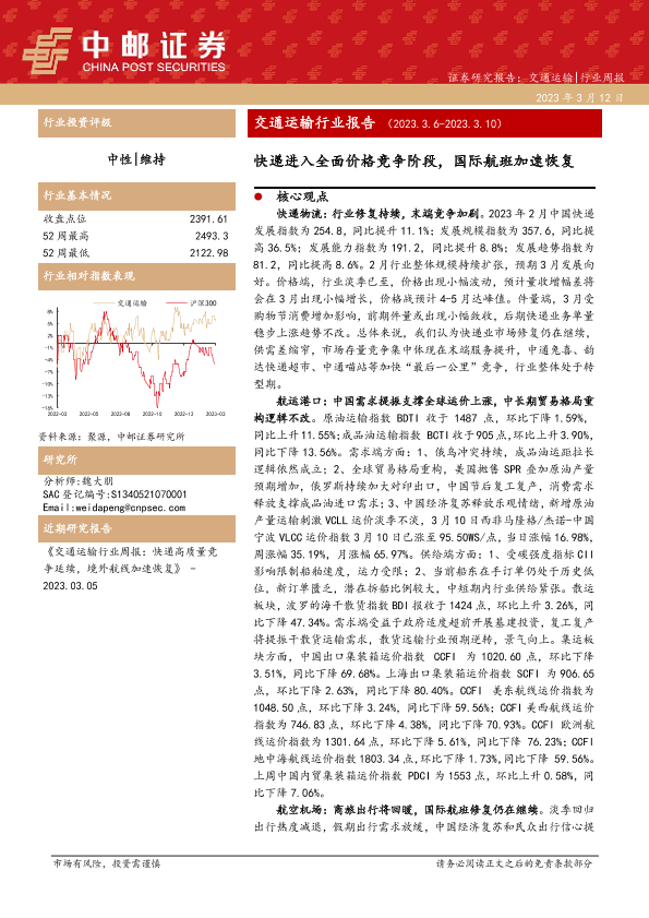 【中邮证券】【20230312】交通运输行业报告:快递进入全面价格竞争阶段,国际航班加速恢复-19页