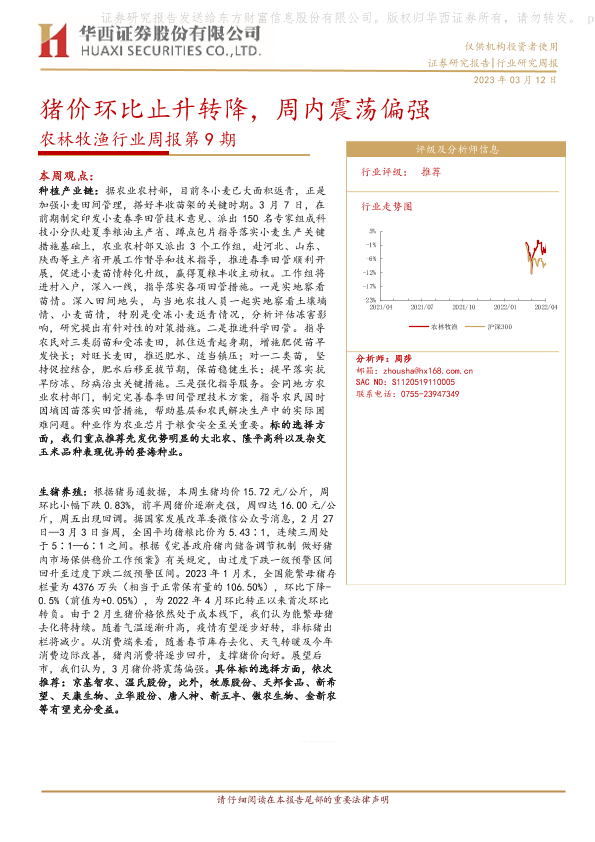 【华西证券】【20230312】农林牧渔行业周报第9期:猪价环比止升转降,周内震荡偏强-25页