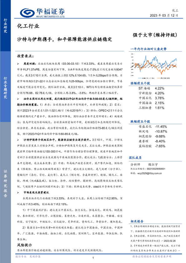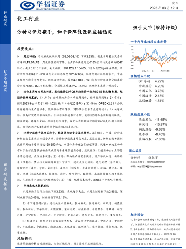 化工行业 市场表现 沙特伊朗关系 油价预测 能源供应链