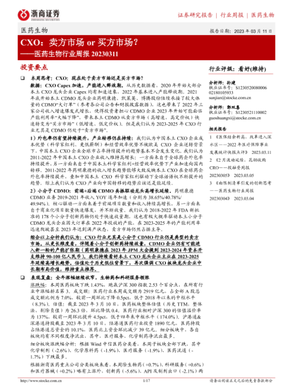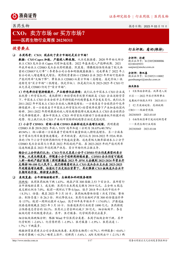 【浙商证券】【20230311】医药生物行业周报:CXO:卖方市场or买方市场?-17页