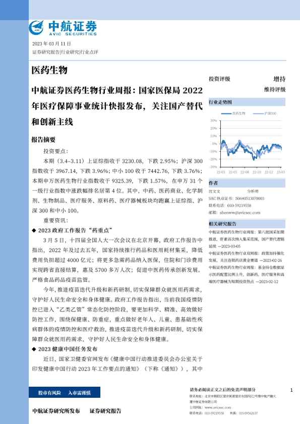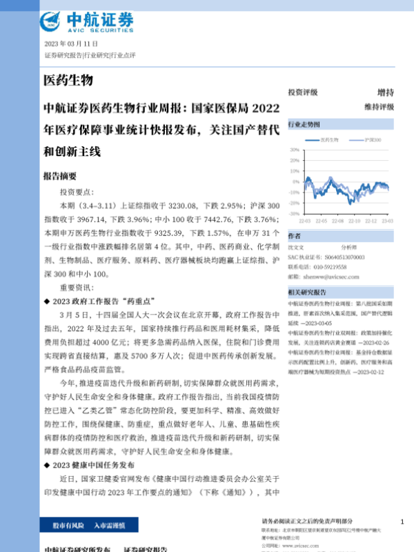 【中航证券】【20230311】医药生物行业周报:国家医保局2022年医疗保障事业统计快报发布,关注国产替代和创新主线-21页