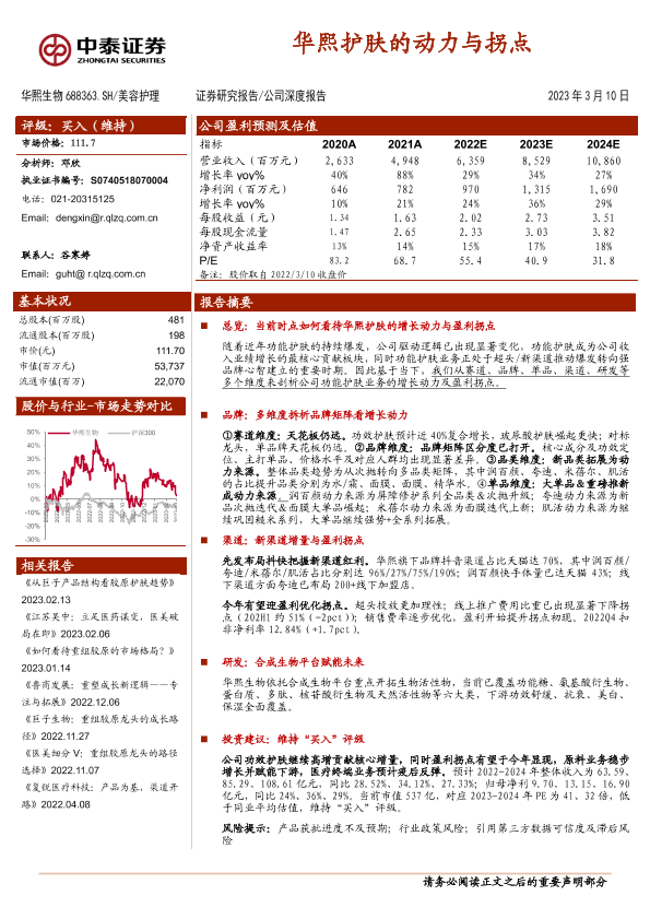 功能护肤 渠道布局 盈利预测 研发进展 华熙生物