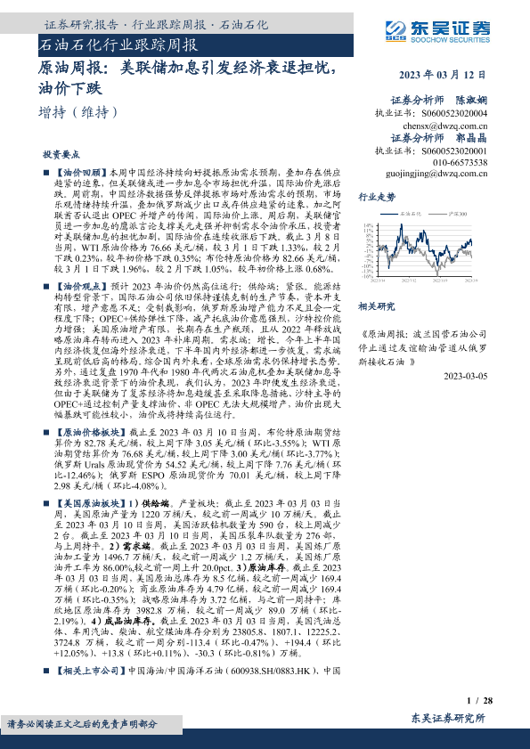 【东吴证券】【20230312】原油周报:美联储加息引发经济衰退担忧,油价下跌-28页