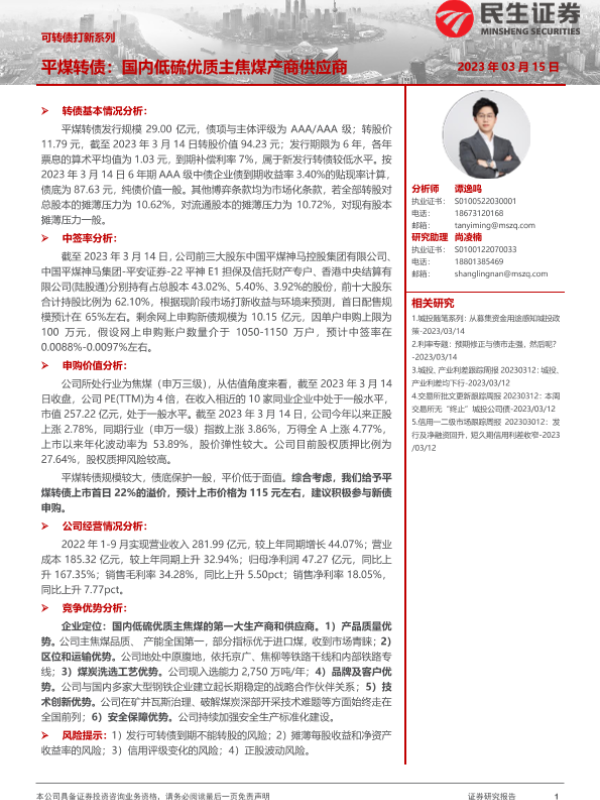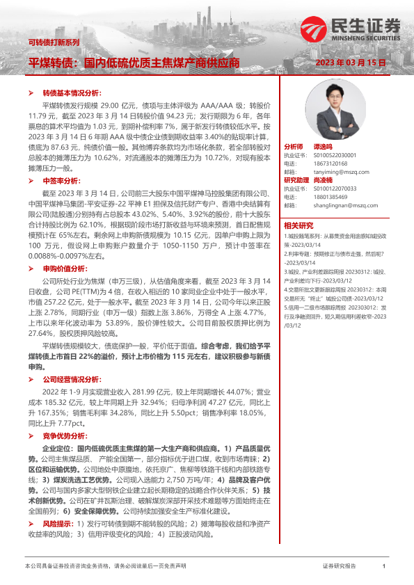 【民生证券】【20230315】可转债打新系列:平煤转债,国内低硫优质主焦煤产商供应商-15页