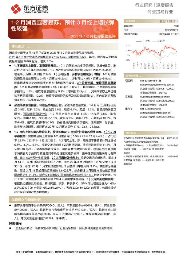 【东方证券】【20230316】商业贸易行业2023年1_2月社零数据点评:1_2月消费显著复苏,预计3月线上增长弹性较强-16页