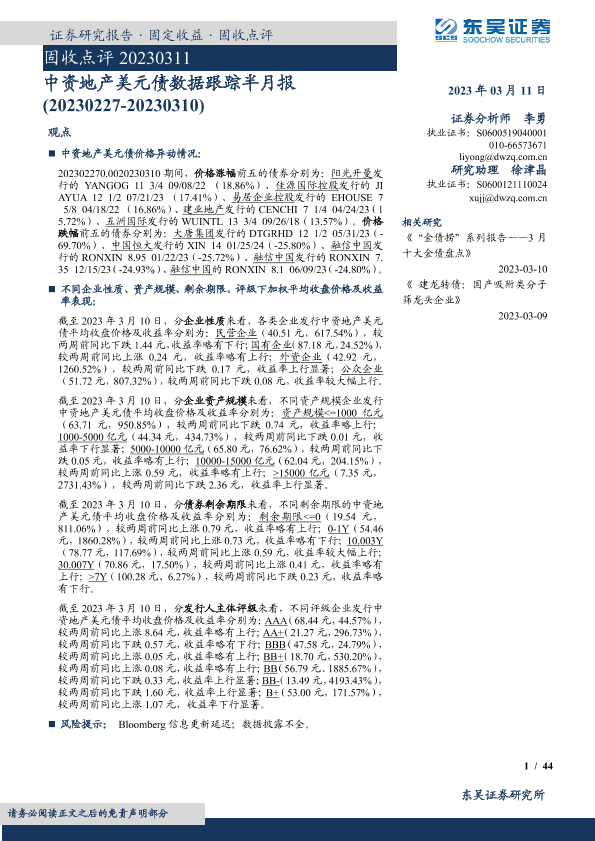 【东吴证券】【20230311】固收点评:中资地产美元债数据跟踪半月报-20230311-44页