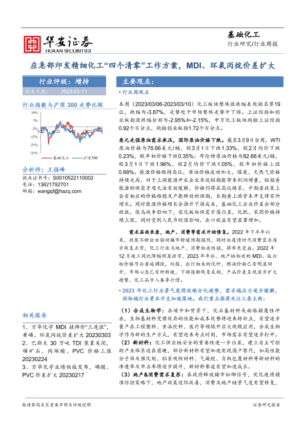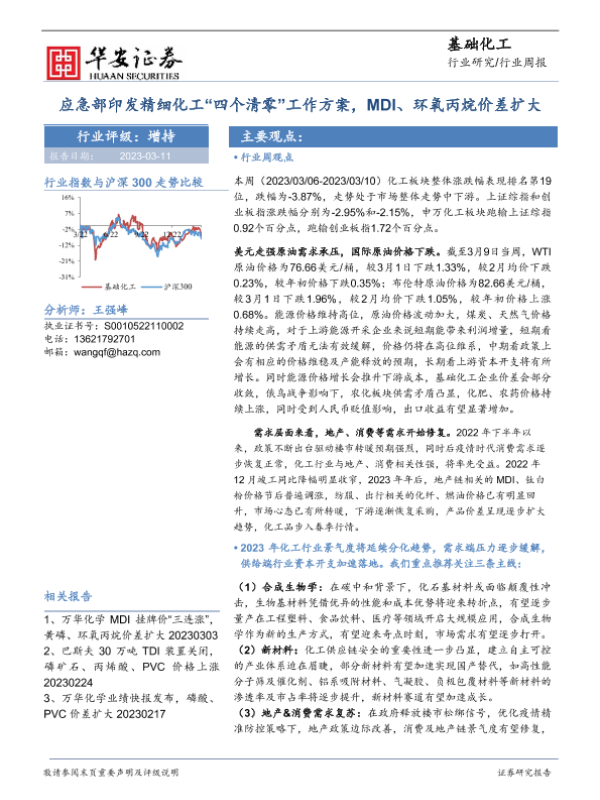 【华安证券】【20230311】基础化工行业周报:应急部印发精细化工“四个清零”工作方案,MDI、环氧丙烷价差扩大-43页