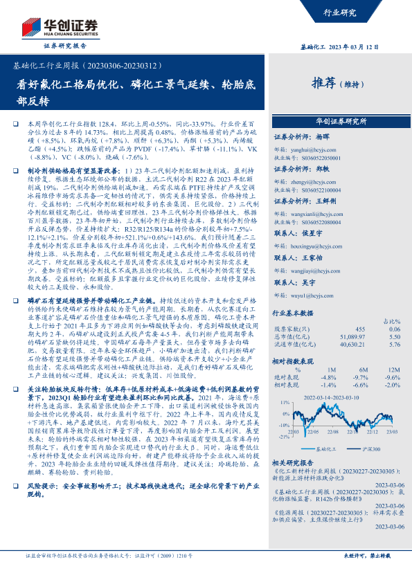 【华创证券】【20230312】基础化工行业周报:看好氟化工格局优化、磷化工景气延续、轮胎底部反转-67页