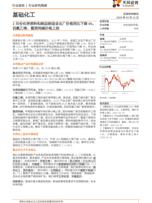 【天风证券】【20230312】基础化工行业研究周报:2月份化学原料和制品制造业出厂价格同比下降6%,四氯乙烯、重质纯碱价格上涨-20页