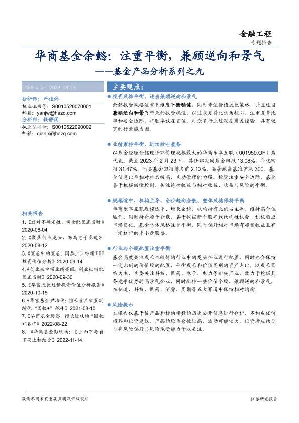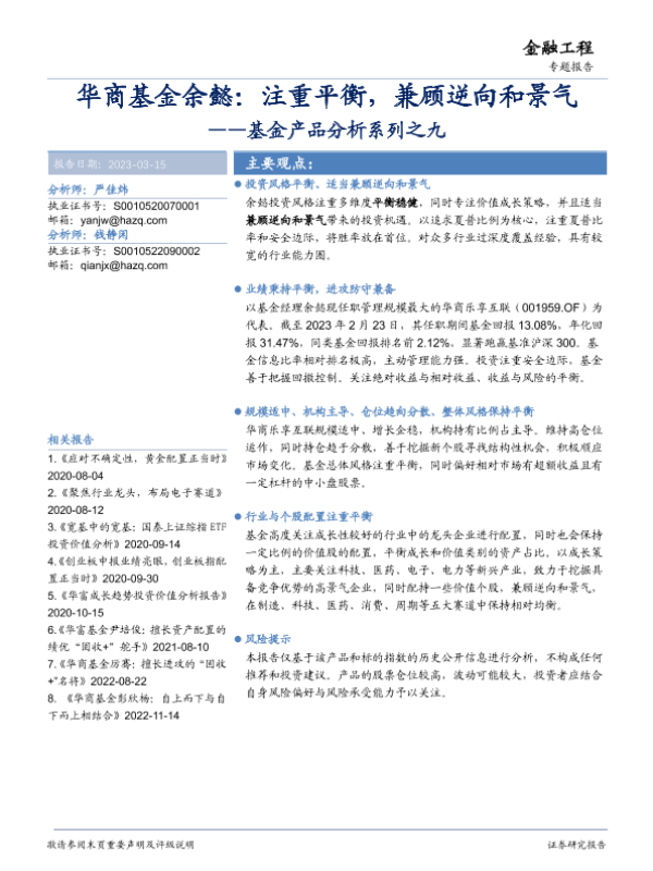 【华安证券】【20230315】基金产品分析系列之九:华商基金余懿,注重平衡,兼顾逆向和景气-19页