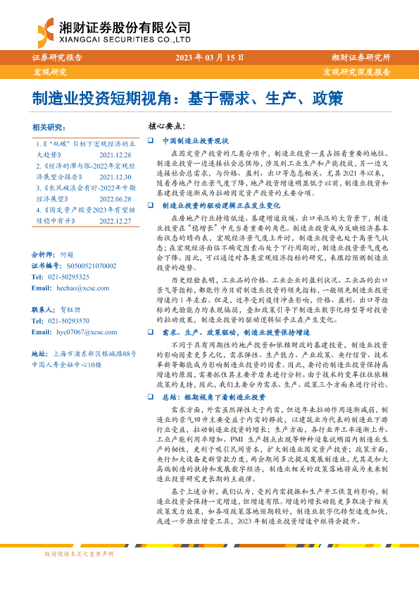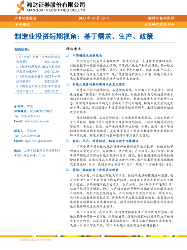 【湘财证券】【20230315】宏观研究深度报告:制造业投资短期视角,基于需求、生产、政策-20页