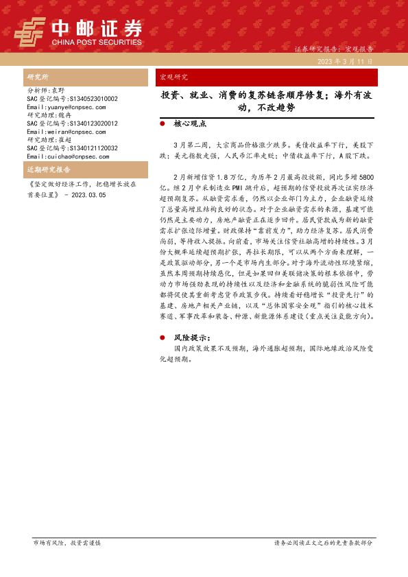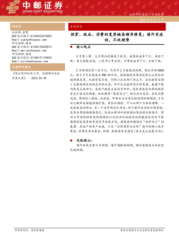 【中邮证券】【20230311】宏观研究:投资、就业、消费的复苏链条顺序修复;海外有波动,不改趋势-22页