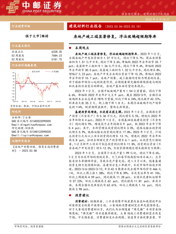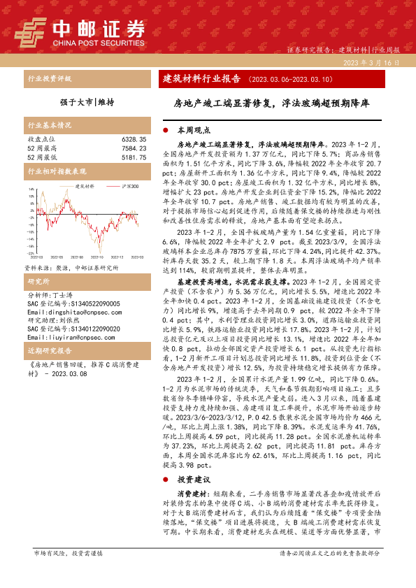 【中邮证券】【20230316】建筑材料行业报告:房地产竣工端显著修复,浮法玻璃超预期降库-18页