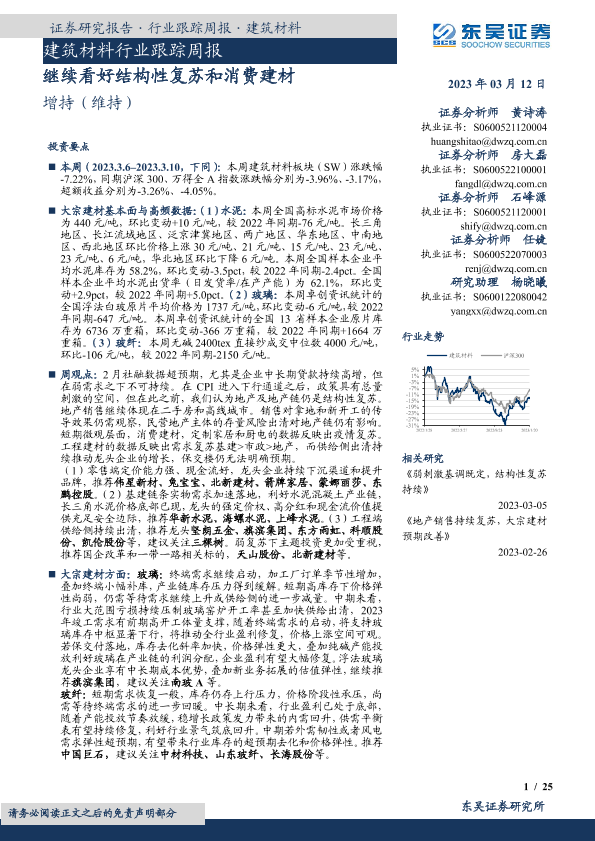 【东吴证券】【20230312】建筑材料行业跟踪周报:继续看好结构性复苏和消费建材-25页