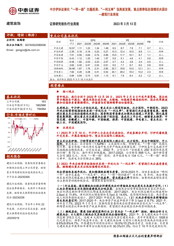 【中泰证券】【20230313】建筑行业周报:中沙伊协议催化“一带一路”主题投资、“一利五率”促高质发展,重点推荐低估值绩优央国企-38页