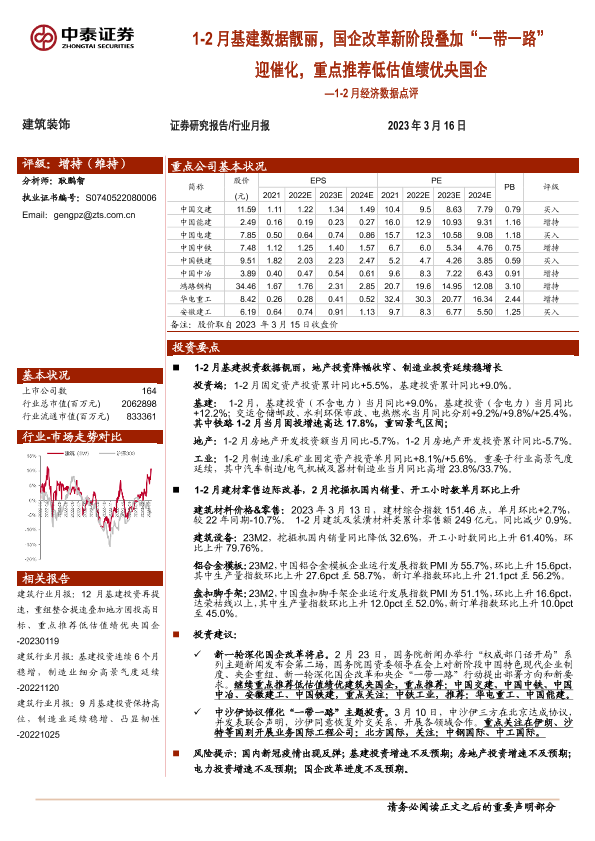 【中泰证券】【20230316】筑装饰行业1_2月经济数据点评:1_2月基建数据靓丽,国企改革新阶段叠加“一带一路”迎催化,重点推荐低估值绩优央国企-19页