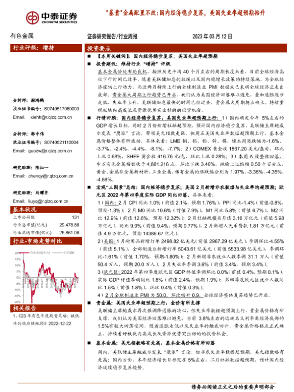 【中泰证券】【20230312】有色金属行业周报:“基贵”金属配置不改:国内经济稳步复苏,美国失业率超预期抬升-30页