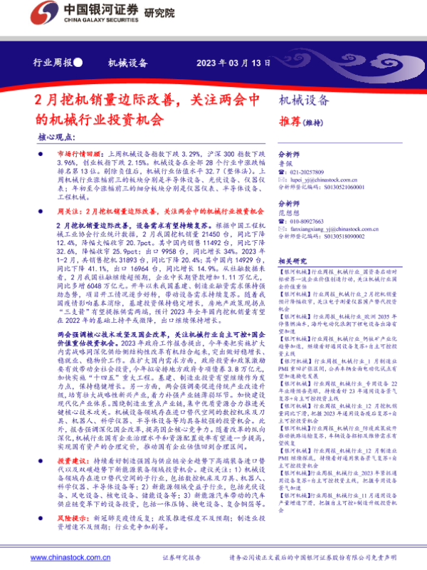 【银河证券】【20230313】机械设备行业周报:2月挖机销量边际改善,关注两会中的机械行业投资机会-22页