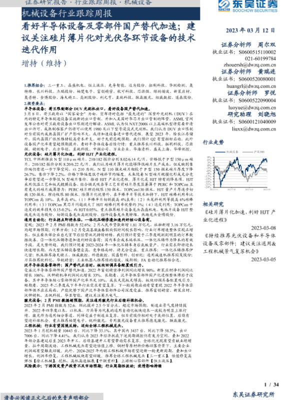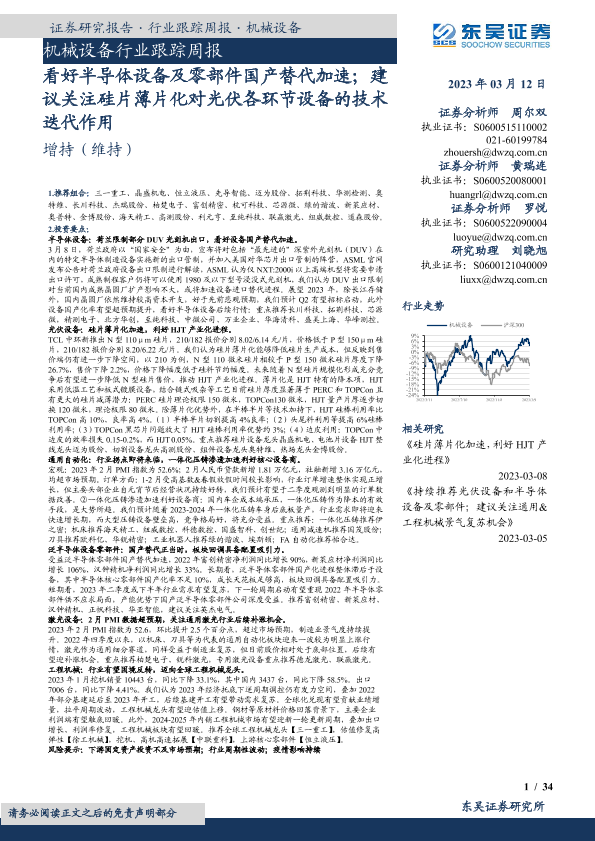 【东吴证券】【20230312】机械设备行业跟踪周报:看好半导体设备及零部件国产替代加速;建议关注硅片薄片化对光伏各环节设备的技术迭代作用-34页
