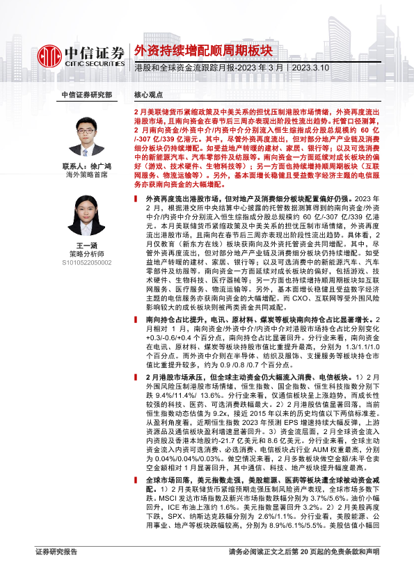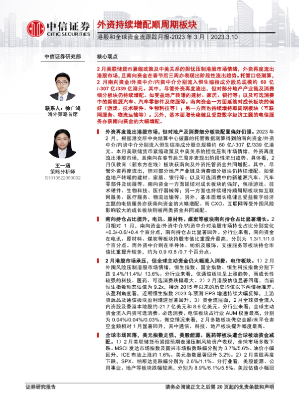 【中信证券】【20230310】港股和全球资金流跟踪月报_2023年3月:外资持续增配顺周期板块-21页