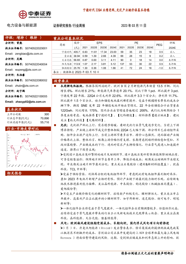 【中泰证券】【20230311】电力设备与新能源行业周报:宁德时代22Q4业绩亮眼,光伏产业链价格基本持稳-31页