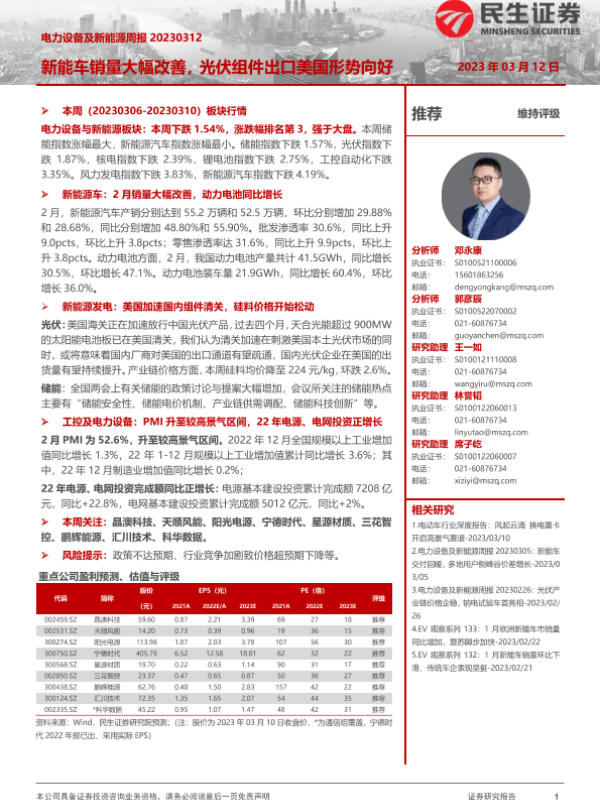 【民生证券】【20230312】电力设备及新能源周报:新能车销量大幅改善,光伏组件出口美国形势向好-30页