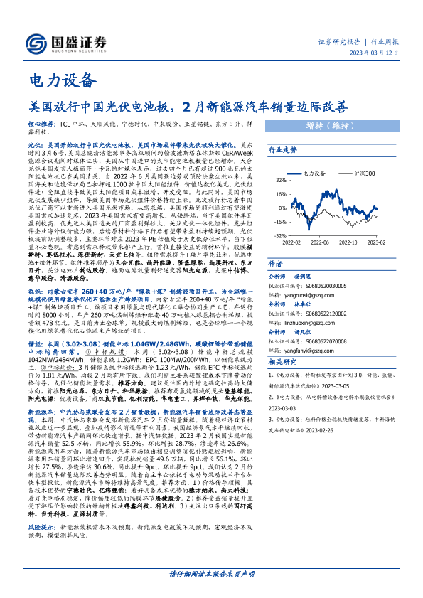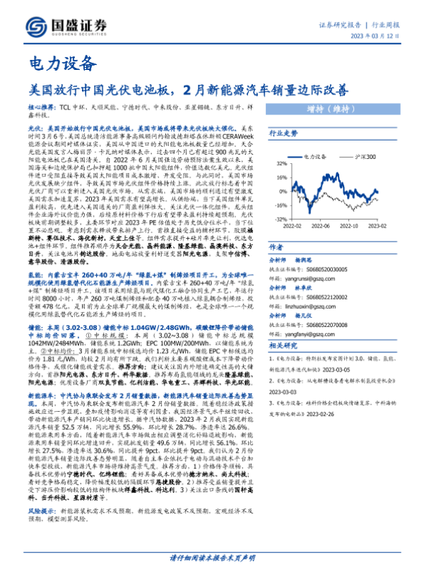 【国盛证券】【20230312】电力设备行业周报:美国放行中国光伏电池板,2月新能源汽车销量边际改善-18页