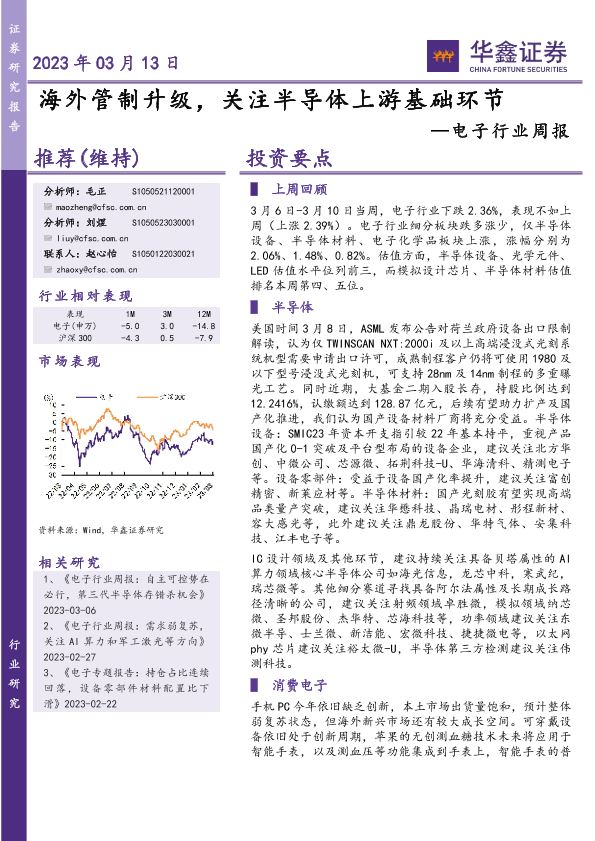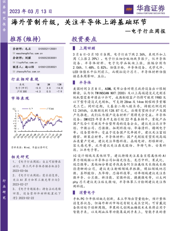 【华鑫证券】【20230313】电子行业周报:海外管制升级,关注半导体上游基础环节-42页