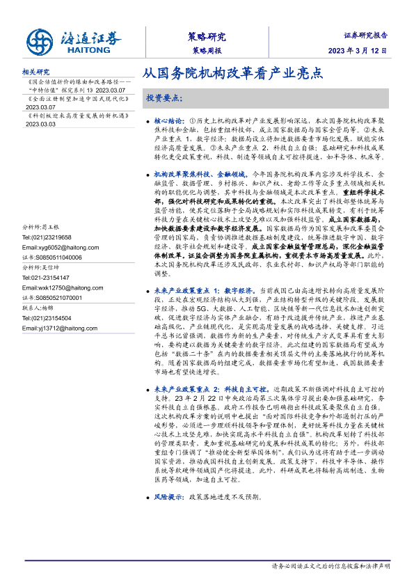 【海通证券】【20230312】策略周报:从国务院机构改革看产业亮点-15页