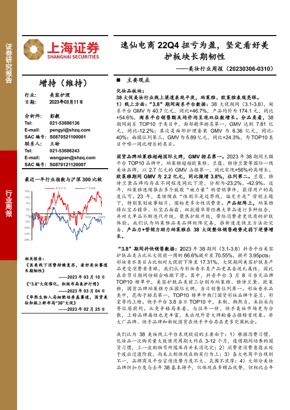【上海证券】【20230311】美妆行业周报:逸仙电商22Q4扭亏为盈,坚定看好美护板块长期韧性-23页