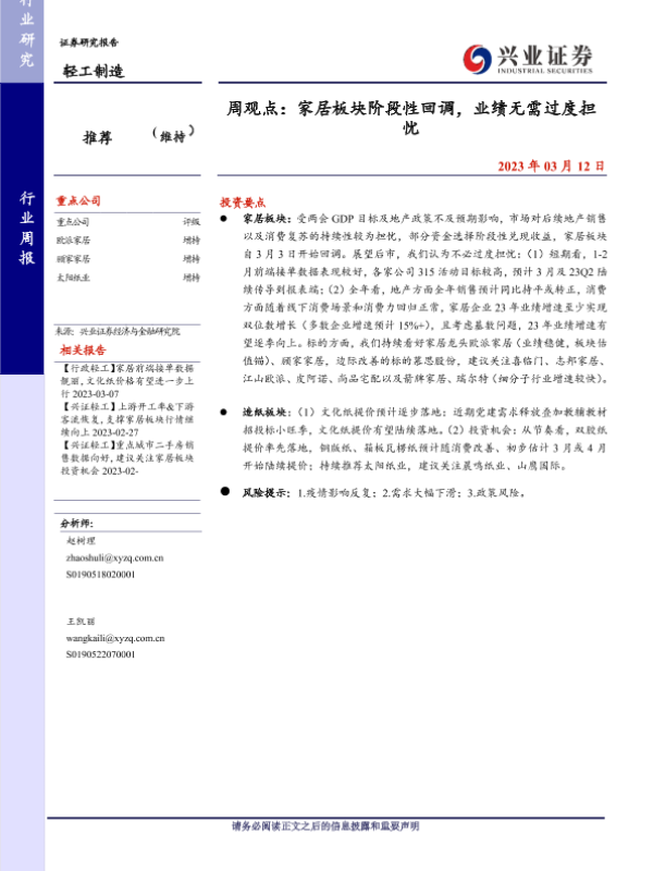 家居板块 市场分析 投资建议 轻工制造 造纸行业