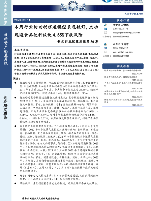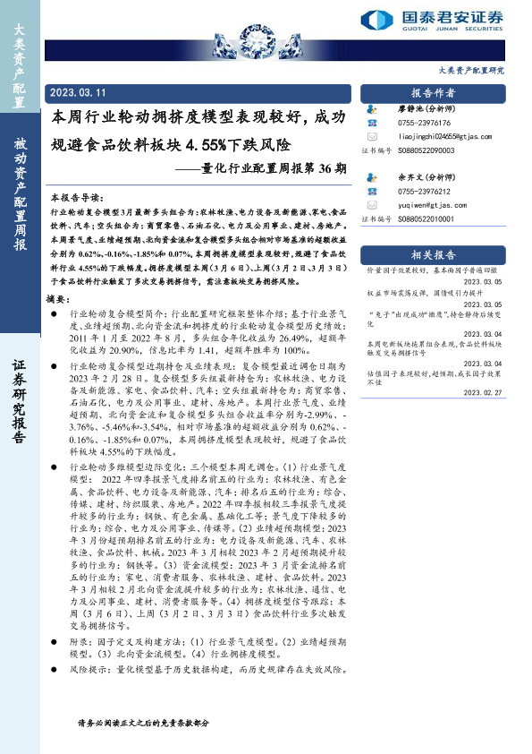 【国泰君安证券】【20230311】量化行业配置周报第36期:本周行业轮动拥挤度模型表现较好,成功规避食品饮料板块4.55%下跌风险-15页