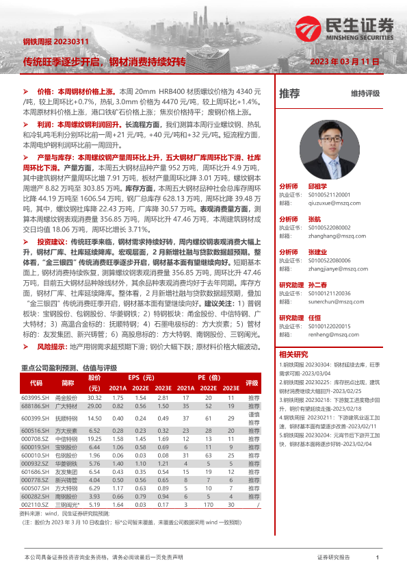 【民生证券】【20230311】钢铁周报:传统旺季逐步开启,钢材消费持续好转-20页