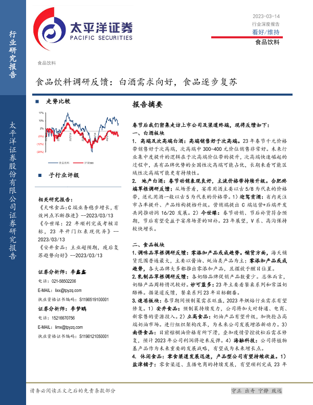 【太平洋证券】【20230314】食品饮料行业调研反馈:白酒需求向好,食品逐步复苏-21页