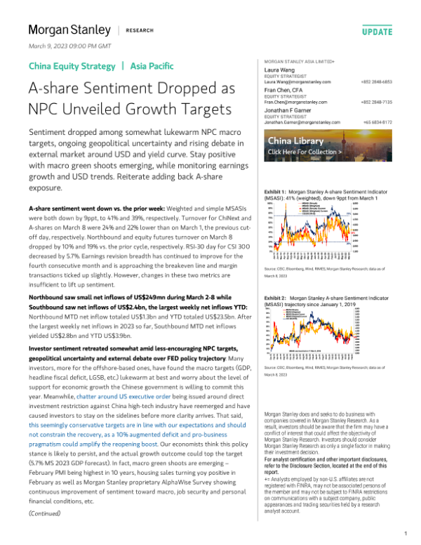 【Morgan Stanley】【20230309】中国股市策略:A股情绪随全国人大会议公布增长目标而下降-11页