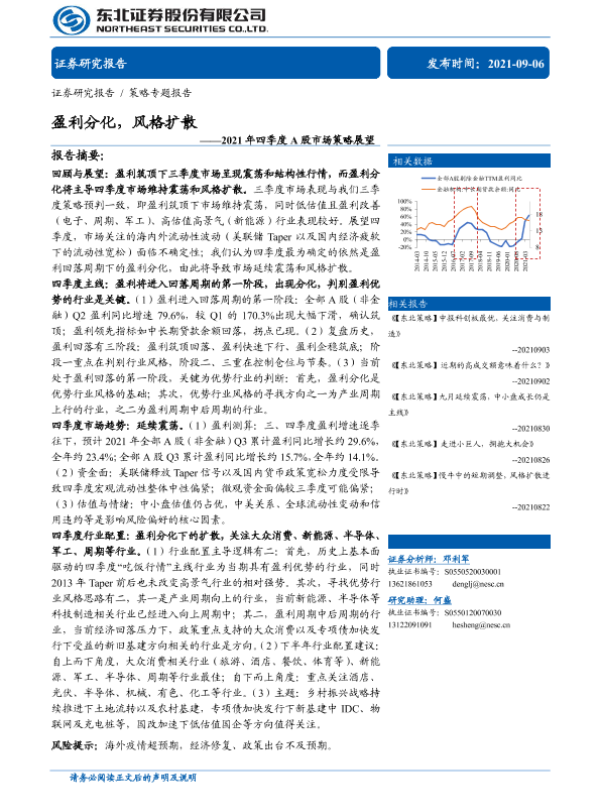 【东北证券】【20210906】2021年四季度A股市场策略展望:盈利分化,风格扩散-33页