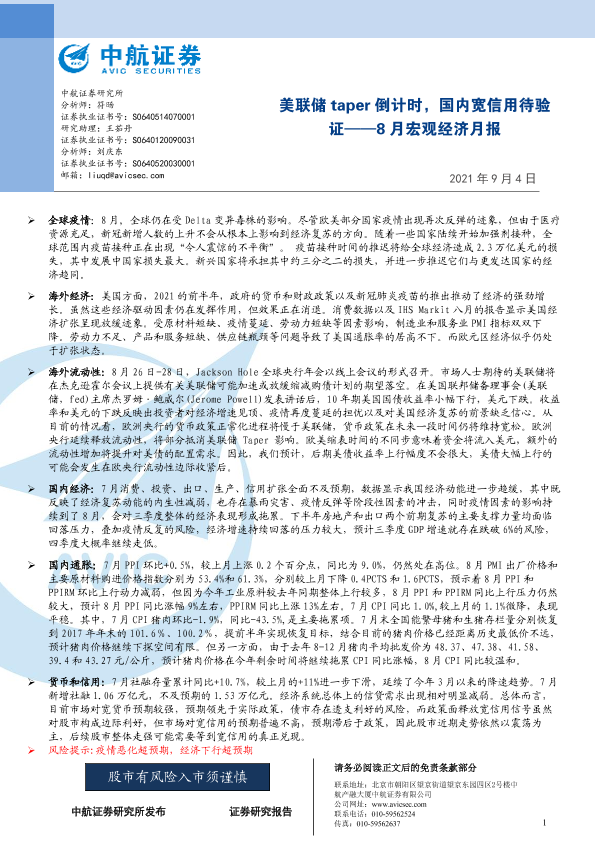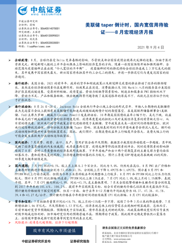 【中航证券】【20210904】8月宏观经济月报:美联储taper倒计时,国内宽信用待验证-25页