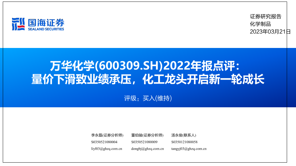 【国海证券】【20230321】2022年报点评:量价下滑致业绩承压,化工龙头开启新一轮成长-22页