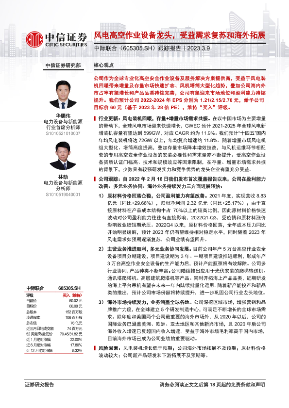 【中信证券】【20230309】中际联合(605305)跟踪报告:风电高空作业设备龙头,受益需求复苏和海外拓展-18页