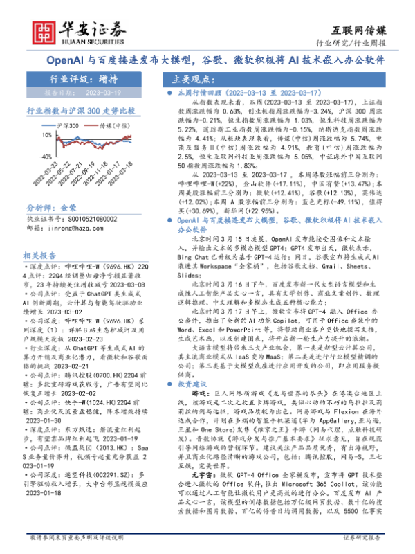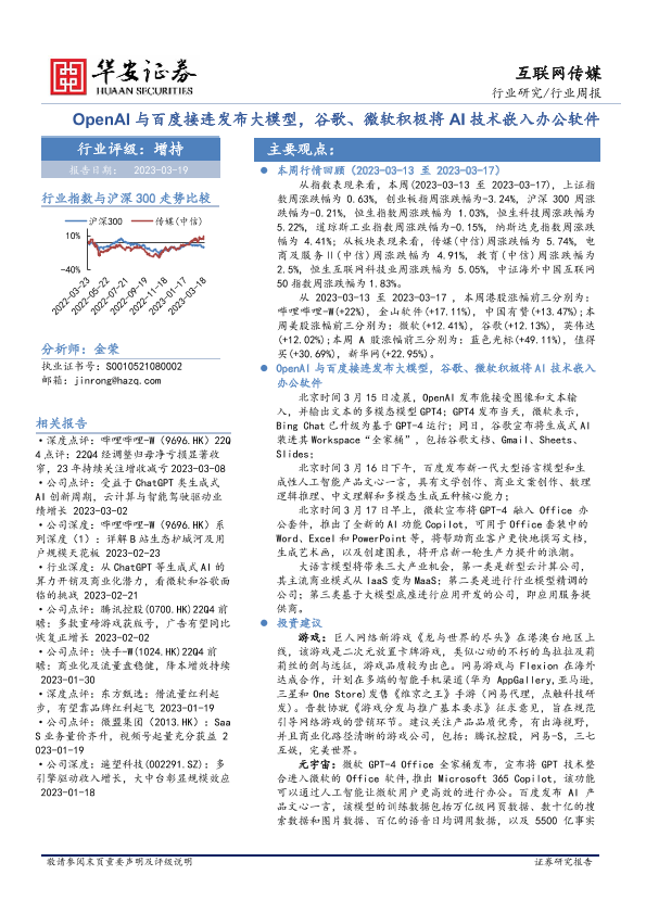 【华安证券】【20230319】互联网传媒行业周报:OpenAI与百度接连发布大模型,谷歌、微软积极将AI技术嵌入办公软件-29页