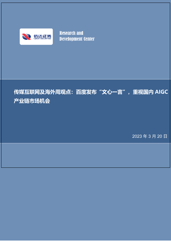 【信达证券】【20230320】传媒互联网及海外周观点:百度发布“文心一言”,重视国内AIGC产业链市场机会-26页