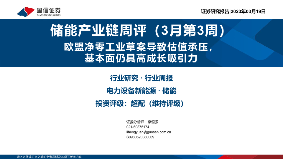 【国信证券】【20230319】储能产业链周评(3月第3周):欧盟净零工业草案导致估值承压,基本面仍具高成长吸引力-20页