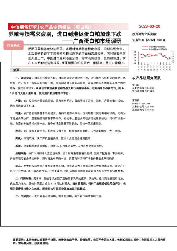 【中信期货】【20230320】农产品专题报告(蛋白粕):广西蛋白粕市场调研,养殖亏损需求疲弱,进口到港促蛋白粕加速下跌-16页