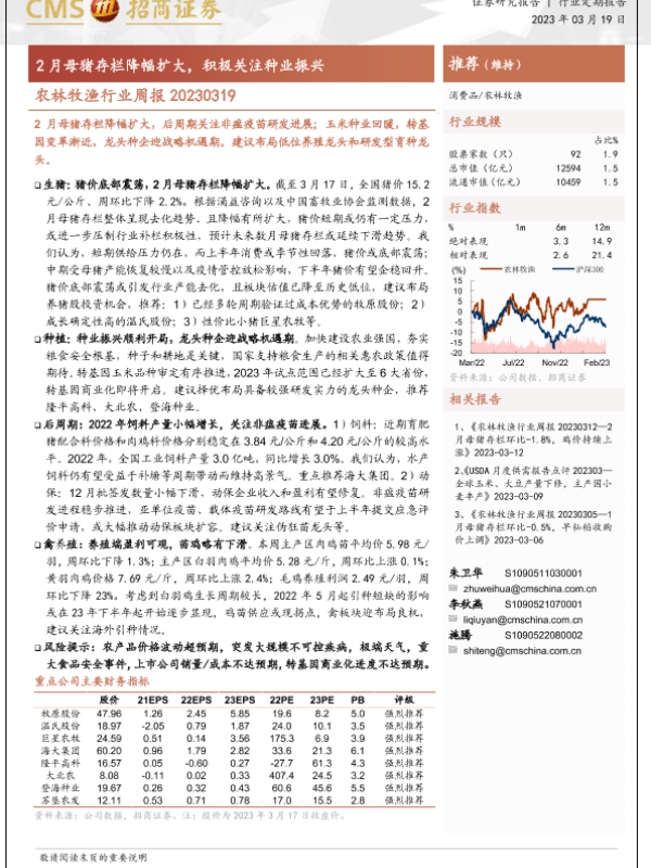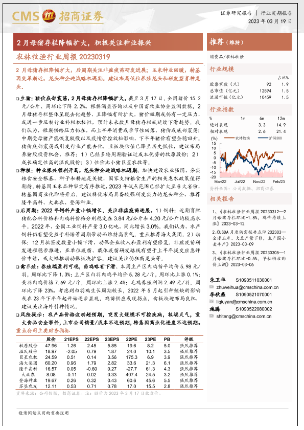 【海通证券】【20230319】农林牧渔行业周报:2月母猪存栏降幅扩大,积极关注种业振兴-15页