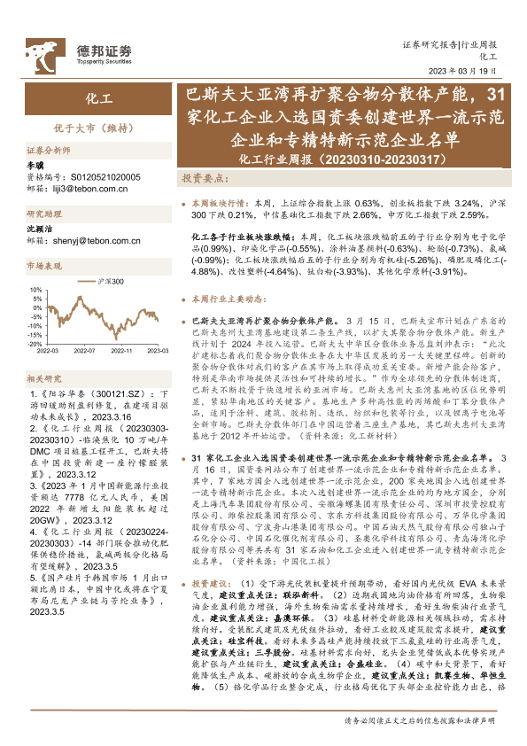 【德邦证券】【20230319】化工行业周报:巴斯夫大亚湾再扩聚合物分散体产能,31家化工企业入选国资委创建世界一流示范企业和专精特新示范企业名单-26页