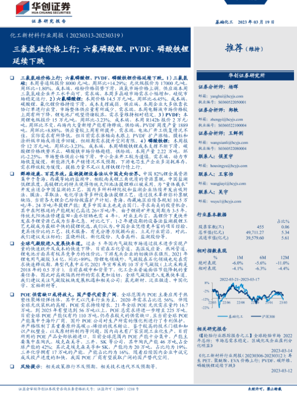 【华创证券】【20230319】化工新材料行业周报:三氯氢硅价格上行;六氟磷酸锂、PVDF、磷酸铁锂延续下跌-57页
